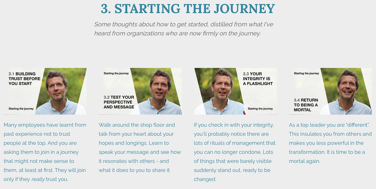 For senior leaders I recommend watching the “Thoughts for top leaders” videos by Frederic Laloux. He has plenty of valuable advice. For example, he says: